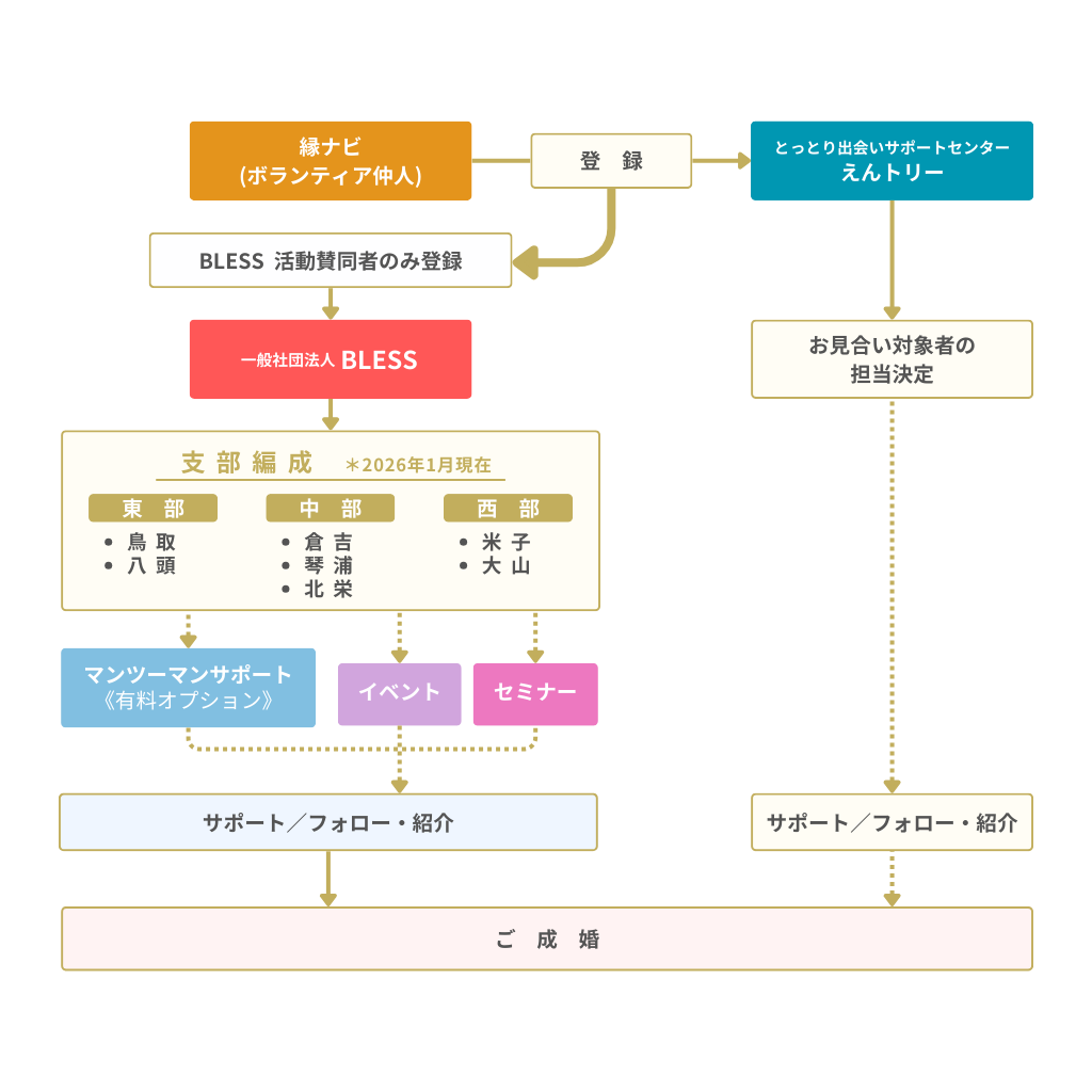 結婚を希望する方々を支援することを目的に、 とっとり出会いサポートセンター「えんトリー」で活動する縁結びナビゲーター(縁ナビ)が中心となり、 一般社団法人BLESSを設立いたしました。