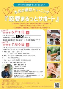 本気の婚活トレーニング「恋愛まるっとサポート」 1年以内に結婚を考えているあなたへ!!本気の婚活トレーニング【恋愛まるっとサポート】講座を開催します。□本気で結婚を考えたい!□いつも失敗ばかり…でも理由がわからない。□そ […]